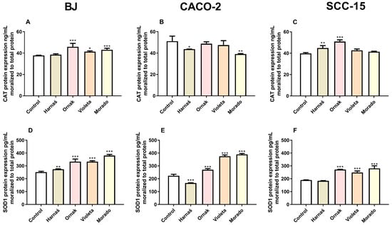 Effect of 0.250 mg/mL of extracts from garlic cultivars Harnaś, Ornak, Violeta, and Morado on protein expression of (A–C) CAT and (D–F) SOD1 in (A,D) BJ, (B,E) CACO-2, and (C,F) SCC-15 cells after 6 h of exposure. Protein levels were normalised to total protein. Results are presented as mean ± SD. Statistically significant differences from the control are marked as * p < 0.05, ** p < 0.01, and *** p < 0.001.