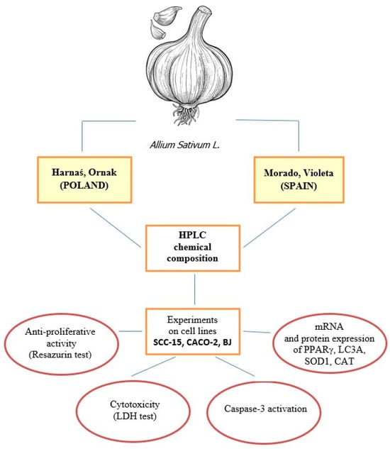 The aim of our study was to compare the antioxidant potential, cytotoxicity, and apoptosis-inducing properties of four garlic cultivars in the human squamous carcinoma (SCC-15) cell line, colon adenocarcinoma (CACO-2) cell line, and normal fibroblast (BJ) cell line. Due to different growth and climate conditions, in our study the two garlic cultivars from Poland (Harnaś, Ornak) and two garlic cultivars from Spain (Violeta and Morado) were selected for analysis. We also evaluated the expression of selected genes and proteins associated with cell metabolism, free radical neutralisation, and the processes of autophagy and apoptosis.