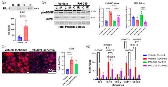We found that following tourniquet-induced IR injury, plasminogen activator inhibitor-1 (PAI-1), a negative regulator of the proBDNF cleaving protein tissue plasminogen activator (tPA), had a significant 3.9-fold increase in the IR-injured skeletal muscle (Figure 3a). To determine whether inhibition of PAI-1 would result in greater extracellular cleavage of proBDNF and a subsequent reduction in inflammation following hindlimb IR injury, wildtype animals were treated with the PAI-1 inhibitor, PAI-039 (tiplaxtinin) or the vehicle control [30]. Western blot revealed an increase in mature BDNF in the injured control limb of PAI-039-treated animals, and following IR injury, proBDNF expression had a 1.6-fold significant reduction in PAI-039-treated animals (Figure 3b). These data indicate that skeletal muscle proBDNF is cleaved extracellularly by plasmin. To determine whether reducing the level of proBDNF via PAI-039 in IR injury would affect the inflammatory phenotype, immunofluorescent staining for CD68—a proinflammatory macrophage marker—in the injured muscle was performed. In the vehicle controls following IR injury, there was a significant 1.2-fold increase in CD68+ staining; however, treatment with PAI-039 did not show any significant increase in CD68+ staining following IR injury (Figure 3c). Additionally, qPCR revealed a significant 1.3-fold decrease in proinflammatory cytokines IL-1B and a significant 9.4-fold reduction in CXCL1 in the injured tissue from animals treated with PAI-039 compared to vehicle-treated animals (Figure 3d). These data show that when proBDNF expression is reduced, the proinflammatory process is blunted in tourniquet-induced IR injury.
