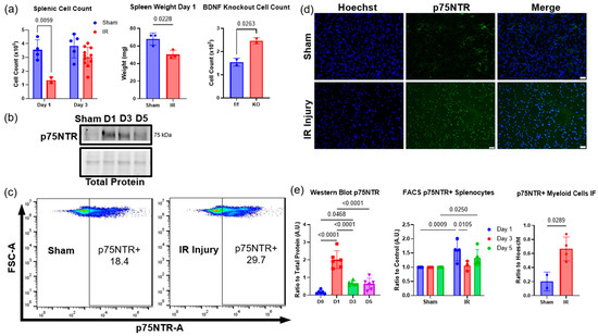 Compared to sham animals, the spleen weight was significantly reduced 1.4-fold and the total splenic monocytes of animals with IR injury were significantly reduced 2-fold, indicating increased monocyte recruitment from the spleen to the site of injury, which is consistent with previous publications [26,28] (Figure 5a). Additionally, in BDNF skmKO animals, the spleen had a significant 1.6-fold increase in monocytes compared to the flox control mice (Figure 5a), suggesting that skeletal muscle-derived proBDNF may be responsible for driving migration of splenic monocytes to the site of injury. Using Western blot, we showed that the receptor for proBDNF, p75NTR, had a 3.2-fold significant increase in expression in splenic monocytes isolated on reperfusion day 1 of tourniquet-induced IR injury (Figure 5b). Flow cytometry analysis showed an increase in p75NTR+ in monocytes isolated from animals with IR injury, which confirmed the Western blot results (Figure 5c). Using immunofluorescent staining for p75NTR in monocytes isolated from sham or IR-injured animals revealed that IR-injured animals showed a 3.4-fold significant increase in p75NTR (Figure 5d). Although we isolated splenic myeloid cells, some lymphocytes may still be present; therefore, we also stained for p75NTR in lymphocytes using CD3+ and CD4+ makers for T cell populations. We did not see any change in p75NTR expression between sham and IR-injured animals in these populations confirming that p75NTR expression is increased in the myeloid cell populations specifically.