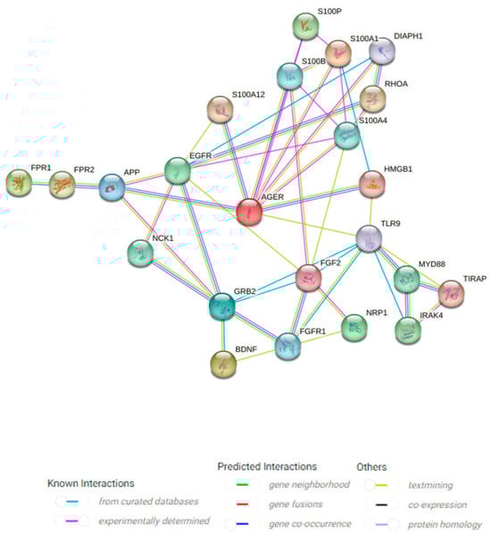 String representation of RAGE–ligand interactions. To ensure understanding, this representation includes exclusively the most significant and extensively researched protein interactions. The highlighted interactions consist of AGER (RAGE), HMGB1, the S100 family of calcium-binding proteins (S100B, S100P, S100A1, S100A4, S100A12), DIAPH1, RhoA, TLR9, MyD88, TIRP4, IRAK4, EGFR, GR-B2, FGFR1, BDNF, FGF2, NRP1, NCK1, Aβ, FPR1, and FPR2. Abbreviations: RAGE, the receptor for advanced glycation end products; HMGB1, high mobility group box 1; DIAPH1, protein diaphanous homolog 1; RhoA, ras homolog family member A; TLR9, toll-like receptor 9; MyD88, myeloid differentiation primary response 88; TIRP4, toll/interleukin-1 receptor domain-containing protein 4; IRAK4, interleukin-1 receptor-associated kinase 4; EGFR, epidermal growth factor receptor; GR-B2, glucocorticoid receptor B2; FGFR1, fibroblast growth factor receptor 1; BDNF, brain-derived neurotrophic factor; FGF2, fibroblast growth factor 2; NRP1, neuropilin-1; NCK1, non-catalytic region of tyrosine kinase adaptor protein 1; Aβ, beta-amyloid peptide; FPR1, fMet-Leu-Phe receptor; FPR2, n-formyl peptide receptor 2. Source: https://string-db.org/ (Accessed on 30 August 2024).