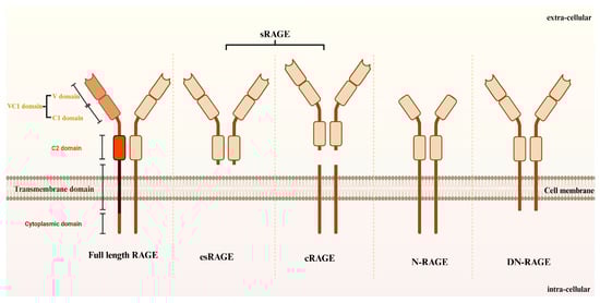 Structure and isoforms of RAGE. As part of the immunoglobulin superfamily, RAGE is categorized among cell surface proteins. It is a type I membrane protein that spans the membrane once and features one variable (V) sector along with two constant (C1 and C2) immunoglobulin-like domains in its external cellular environment. Following this is a transmembrane region, along with a cytoplasmic domain that has a high charge density. The primary isoforms of RAGE comprise full-length RAGE, cleaved RAGE (cRAGE), endogenous secretory RAGE (esRAGE), N-terminal truncated RAGE (N-RAGE), and dominant-negative RAGE (DN-RAGE) (Created in https://BioRender.com) (Accessed 27 September 2024).