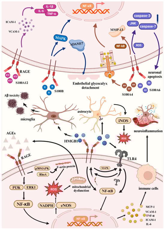 RAGE and its ligands interaction signaling pathways. Following the activation of the AGE-RAGE signaling cascade, the stimulation of the ERK1 and PI3K pathways can activate the nuclear factor NF-κB. This factor then translocates to the nucleus, promoting ROS production, which ultimately leads to cellular damage and mitochondrial dysfunction. NF-κB is capable of translocating to the nucleus, where it facilitates the transcription of pro-inflammatory cytokines and chemokines, including TNF-α, IL-6, MCP-1, VCAM-1, and ICAM-1. This process promotes inflammation and activates immune cells. AGEs can also activate p38 MAPK and RhoA kinase, which modifies the shape of the endothelial F-actin cytoskeleton and enhances the permeability of the endothelial cell monolayer. HMGB1 binding to RAGE acts as a key initiator of neuroinflammation and can also bind to TLR4, participating in neuroinflammation and neurotoxicity. The interaction between HMGB1 and RAGE initiates the activation of MAPK, which facilitates the translocation of TLR4 to the cell surface. Moreover, TLR4 at the cell membrane can interact with HMGB1, leading to the transcription and translation of RAGE, which in turn promotes the translocation of RAGE to the cell surface. HMGB1 inhibits microglial activation and phagocytosis through RAGE, promoting the accumulation of neuronal Aβ. HMGB1 activates astrocytes, increasing iNOS expression in cortical astrocytes via TLR4 signaling. S100A4 binds to RAGE and initiates a signaling cascade that ultimately causes MMP-13 release through the NF-κB pathway in chondrocytes. Two neurotrophic motifs on S100A4 activate the JAK/STAT pathway, preventing neurodegeneration. S100A6 promotes neuronal apoptosis through its interaction with RAGE, which triggers activation of JNK dependent on ROS as well as caspases-3 and -7. S100A12 binding to RAGE increases the activation and discharge of NF-κB, IL-1β, IL-6, and TNF-α. S100B accumulates at the RAGE receptor sites, resulting in the initiation of downstream MAPK pathways, which subsequently leads to the phosphorylation and activation of NF-κB. Stimulation of S100B/RAGE signaling can promote the shedding of the endothelial glycocalyx by enhancing the expression, translocation, and activity of the sheddase ADAM17 in endothelial cells. Abbreviations: RAGE, the receptor for advanced glycation end products; ERK, extracellular signal-regulated kinase; PI3K, phosphatidylinositol-3 kinase; ROS, reactive oxygen species; NF-κB, nuclear factor-kappa B; TNF-α, tumor necrosis factor-alpha; IL-6, interleukin-6; MCP-1, monocyte chemoattractant protein-1; VCAM-1, vascular cell adhesion molecule-1; ICAM-1, intercellular adhesion molecule-1; AGEs, advanced glycation end products; p38 MAPK, p38 mitogen-activated protein kinase; RhoA, Rho family GTPase A; HMGB1, high mobility group box 1; TLR4, toll-like receptor 4; MAPK, mitogen-activated protein kinase; Aβ, beta-amyloid peptide; iNOS, inducible nitric oxide synthase; MMP-13, matrix metalloproteinase-13; JAK/STAT, Janus kinase/signal transducer and activator of transcription; JNK, c-Jun N-terminal kinase; ADAM17, a disintegrin and metalloproteinase 17 (Created in https://BioRender.com). The arrow colors correspond to the colors of the ligands in the figure, each activating different signaling pathways (Accessed on 2 January 2025).