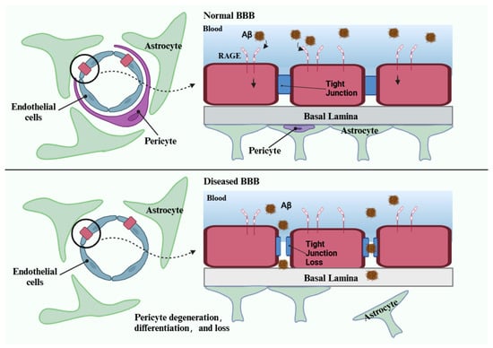 Aβ(Beta-amyloid peptide) transport across the normal and disrupted blood–brain barrier (BBB). RAGE mediates the transport of circulating Aβ from plasma to the brain across the BBB. Disruption of the BBB impairs the vascular clearance of brain Aβ and may increase the influx of peripheral Aβ into the brain. (Created in https://BioRender.com). (Accessed on 2 January 2025).