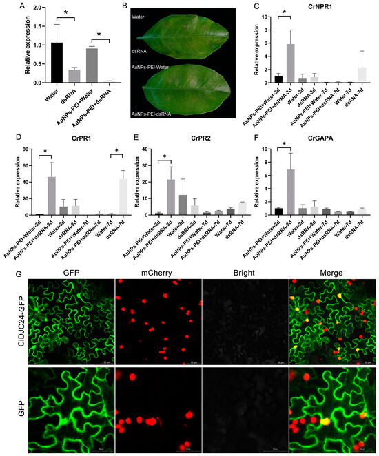 ClDJC24-dsRNA silencing affects the expression patterns of immune genes in response to Citrus HLB. (A) The expression level of ClDJC24 in HLB-infected citrus leaves in 3 d treated with ClDJC24-dsRNA and AuNPs-PEI + ClDJC24-dsRNA, water, and AuNPs-PEI + water was analyzed by qRT-PCR. (B) The disease symptoms of dsRNA and AuNPs-PEI + dsRNA, water, and AuNPs-PEI + water treated HLB-infected citrus leaves. (C–F) represented the expression patterns of immune genes (CrNPR1, CrPR1, CrPR2, CrGAPA) in response to Citrus HLB. Data are presented as means ± SDs (n = 3). “*” symbol above the columns indicates a significant difference at p < 0.05. (G) Subcellular localization of ClDJC24 uses a nuclear-localized marker transgenic Nicotiana benthamiana (NLS-mCherry-OE). The GFP empty vector was used as a control. Photographs were taken at 3 d post-infiltration. Scale bar = 50 μm.