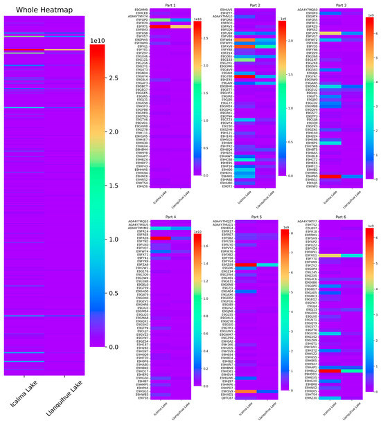 Differential protein expression in D. pulex from lakes at Icalma (left column) and Llanquihue (right column). The total proteins are displayed in a comprehensive heat map, subdivided into six parts (Part 1, 2, 3, 4, 5, and 6) for a detailed comparison of their differences.