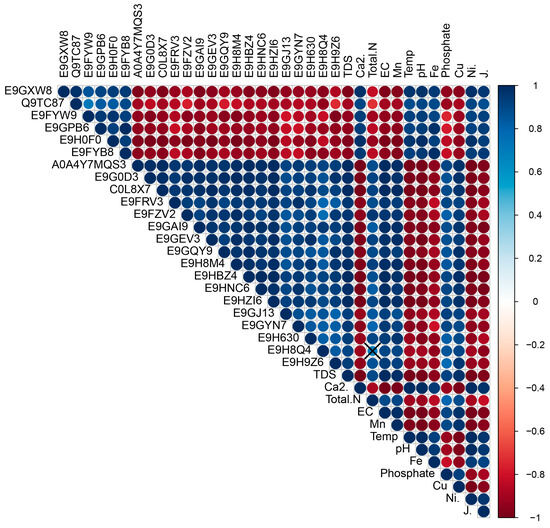 Correlation matrix of protein expression values in relation to various physicochemical (total dissolved solids [TDS], dissolved calcium [Ca2+], total nitrogen, electrical conductivity [EC], manganese [Mn], temperature, dissolved iron [Fe], dissolved copper [Cu]) and ecological variables (specific abundance [Ni], evenness [J’]) at sampling sites in Lakes Icalma and Llanquihue. Proteins are labeled using FASTA numbers. Positive correlations are denoted by blue circles, while negative correlations are indicated by red circles. Circles without a cross represent significant correlations (p ≤ 0.05) as determined by Pearson’s test.