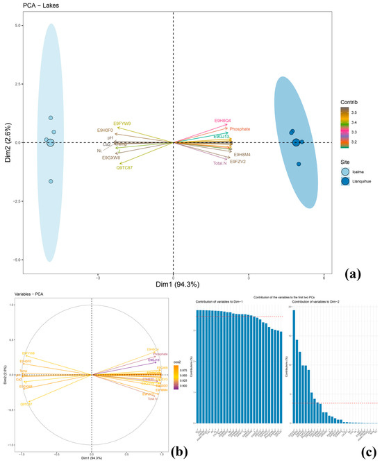 PCA of protein expression, labeled using FASTA numbers, alongside various physicochemical (total dissolved solids [TDS], dissolved calcium [Ca2+], total nitrogen, electrical conductivity [EC], manganese [Mn], temperature, dissolved iron [Fe], dissolved copper [Cu]) and ecological variables (specific abundance [Ni], evenness [J’]), measured in Lakes Icalma and Llanquihue. The figure includes a PCA biplot (a), a biplot showing only the variables (b), and the contribution of these variables to the PCA (c). It explains 94.3% of the variance in PC1 and 2.6% in PC2 axes.