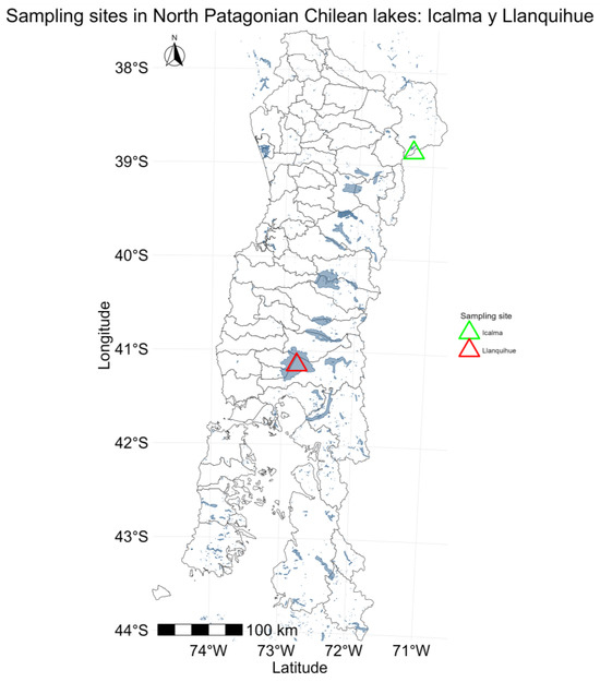 Lakes in Chilean Northern Patagonia, characterized by low nutrient levels (oligotrophic), were classified based on their morphology, physicochemical properties, biodiversity, and environmental conditions during the 1980s and 1990s [4,13,14,15,16]. However, in recent decades, the expansion of agriculture, livestock, forestry, and aquaculture has led to increased soil and water pollution, largely due to intensive and unsustainable resource management practices [17,18,19,20]. Lake Llanquihue is notably affected by heavy metal pollution, including copper and manganese, primarily from agricultural runoff, aquaculture activities, and urban discharge [4,21]. In contrast, Lake Icalma remains relatively untouched, serving as an ideal reference site for studying natural ecosystems [4].