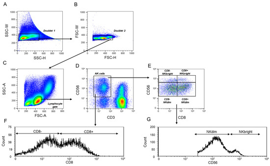 Differentiation of the NK subpopulations using flow cytometric analyses. A flow cytometric gating strategy selected the investigated peripheral CD8+ and CD8− NKdim and NKbright immune cell subpopulations. After a doublet exclusion (A,B), the lymphocyte gate was created using FSC-A/SSC-A parameters (C). The NK cell population was gated from the lymphocyte gate based on the CD3−/CD56+ combination (D). Based on the density of the CD56 receptor, the NKdim and NKbright subpopulations were differentiated from the NK cell gate (E,G). From the NK cell subsets based on the presence of the CD8 receptor (F), further subpopulations were differentiated.