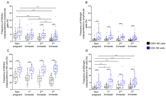 In the case of NKbright cells, the frequency of CD8− NKbright cells in both the lymphocyte gate and the NKdim cell population was significantly higher in all cohorts compared to the CD8+ counterparts (Figure 2B,D). The CD8+ NKbright cells showed a significant increase in all trimesters compared to non-pregnant women; however, a similar significant elevation was found in the case of CD8− NKbright cells only in the first and second trimesters compared to non-pregnant controls (Figure 2D).