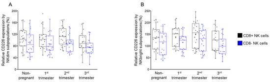 Performing a regression analysis to examine the relationship between the serum levels of the soluble CD226 molecule and the relative CD226 expression, a statistically significant negative relationship was observed within both the CD8+ and CD8− NKdim and NKbright subpopulations, specifically limited to the third trimester of pregnancy (Figure 6 and Figure 7).