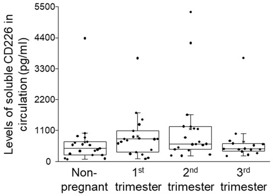 Soluble CD226 levels throughout healthy pregnancy and in non-pregnant women. The serum concentration of the sCD226 molecule in the four investigated cohorts. The solid bars represent medians of 20, 21, 20 and 18 determinations, the boxes indicate the interquartile ranges and the whiskers represent the variability of the minimum, maximum and any outlier data points in comparison to the interquartile range.