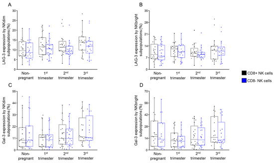 LAG-3 and Galectin-3 expression by NKdim and NKbright subpopulations throughout healthy pregnancy and in non-pregnant women. The expression of LAG-3 (A,B) and Galectin-3 receptors (C,D) by CD8-receptor-positive and CD8-receptor-negative NKdim and NKbright cells during the three trimesters of healthy pregnancy and in healthy non-pregnant women. The solid bars represent medians of 20, 20, 20 and 18 determinations, the boxes indicate the interquartile ranges, the whiskers represent the variability of the minimum, maximum and any outlier data points in comparison to the interquartile range.