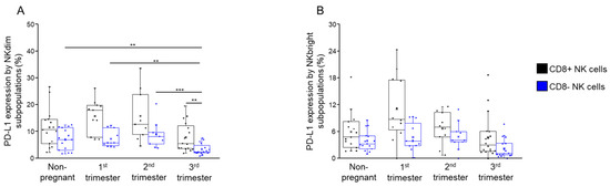 Since we could not detect any PD-1 positivity on any NK cell subsets in the peripheral blood of healthy pregnant individuals [37], we measured the surface expression of PD-L1 on NKdim and NKbright cells by flow cytometry. A significant decrease in PD-L1 expression was observed by the CD8− NKdim subset when compared to the CD8+ NKdim cells, but only in women from the third trimester (Figure 10A). Additionally, when comparing the results between the cohorts, it was found that the PD-L1 expression by CD8− NKdim cells mentioned above was significantly lower compared to the other investigated cohort (Figure 10A). A significant difference regarding PD-L1 expression by NKbright subpopulations was not observed (Figure 10B).