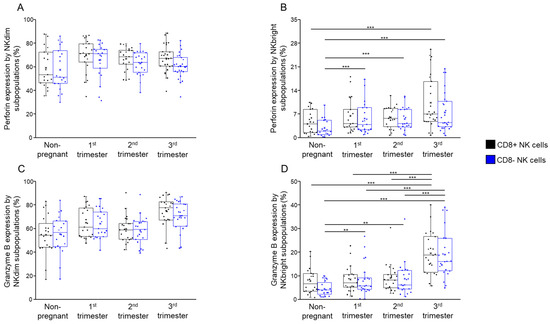 However, no statistical difference was revealed regarding the NKdim subpopulations (Figure 12A,C), and the expression of perforin by CD8− NKbright cells was found to be significantly increased throughout pregnancy compared to the non-pregnant state (Figure 12B). Conversely, CD8+ NKbright cells exhibited higher perforin expression only during the third trimester when compared to non-pregnant women (Figure 12B). On the other hand, CD8+ NKbright cells exhibited a significant increase in granzyme B expression only during the third trimester of healthy pregnancy compared to non-pregnant controls (Figure 12D).