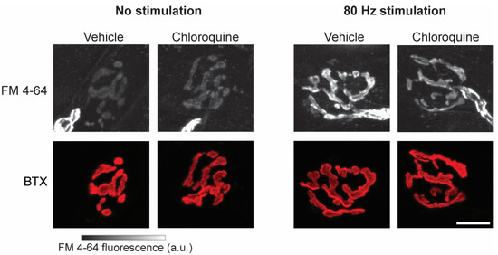 In the present study, the styryl dye FM 4-64 was used to label the presynaptic terminal membrane and any internalized membrane following high-frequency stimulation. As expected, increased FM 4-64 fluorescence intensity was evident at diaphragm presynaptic terminals in both the vehicle and chloroquine treatment groups following 80 Hz stimulation. This suggests that synaptic vesicles and endosomes are labeled at this high-frequency stimulation, aligning with the expected induction of bulk endocytosis. However, in conditions without stimulation, FM 4-64 fluorescence specifically highlights synaptic vesicles, as bulk endosomes are typically not generated without high-frequency input. These findings underscore the effectiveness of FM 4-64 in visualizing synaptic activity and endocytosis processes. The differential labeling patterns observed under stimulated and nonstimulated conditions provide valuable insights into the dynamics of synaptic vesicle cycling and endocytosis in response to varying neural activity levels. In agreement, we previously showed increased cholera toxin subunit B (CTB) uptake in neuromuscular junctions following 80 Hz stimulation compared to 20 Hz stimulation [25]. The increase in lipid raft uptake (labeled by CTB) reflects the transition from endocytic mechanisms primarily reliant on clathrin-mediated vesicle retrieval to bulk endocytosis [26,27]. In the present study, disrupted endosomal trafficking following chloroquine treatment was evident in the absence of stimulation, where it is expected that only synaptic vesicles participating in spontaneous neurotransmitter release corresponding to miniature endplate potentials were labeled by an increase in FM 4-64 uptake [33]. The nature and extent of endosomal trafficking during nonstimulated conditions is poorly understood. Regardless, under high-frequency stimulation, bulk endocytosis pathways play an important role in the trafficking of synaptic membranes [25,26]. Chloroquine treatment reduced FM4-64 uptake during 80 Hz stimulation, suggesting disrupted presynaptic membrane retrieval. These findings suggest that the interplay between autophagy and synaptic vesicle or endosomal trafficking is of significant interest and should be the subject of further study.