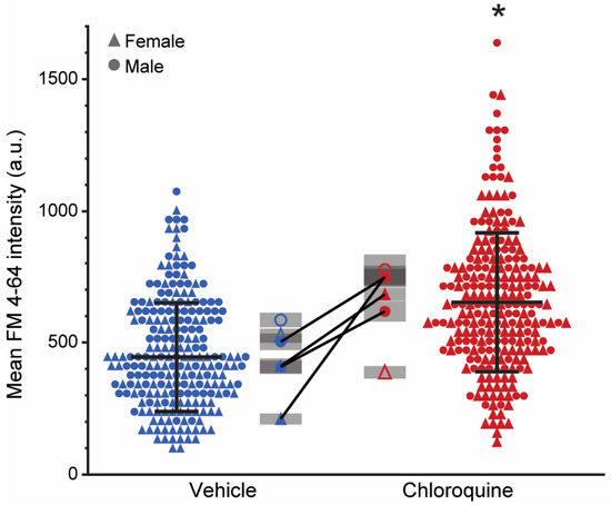 Mean FM 4-64 intensity at diaphragm neuromuscular junctions following vehicle or chloroquine treatment in the no-stimulation group. The scatter plots display FM 4-64 fluorescence intensity of individual neuromuscular junctions from vehicle (far left, blue) and chloroquine (far right, red) groups. Each point represents the FM 4-64 intensity of a single neuromuscular junction. The center line and error bars represent the mean and standard deviation for the entire group. In nonstimulated neuromuscular junctions, FM 4-64 was higher in the chloroquine group (F1,452 = 165, p < 0.01). Shaded plots positioned in the center next to each scatter plot represent the averaged values per hemidiaphragm with the mean FM 4-64 intensity for each hemidiaphragm as points and the standard error for neuromuscular junctions in that hemidiaphragm in the shaded bars. The solid black lines connecting points represent the hemidiaphragms from the same animal where one was treated with vehicle and the other with chloroquine. Symbols represent females and males as triangles and circles, respectively. *, p < 0.05 effect of treatment.