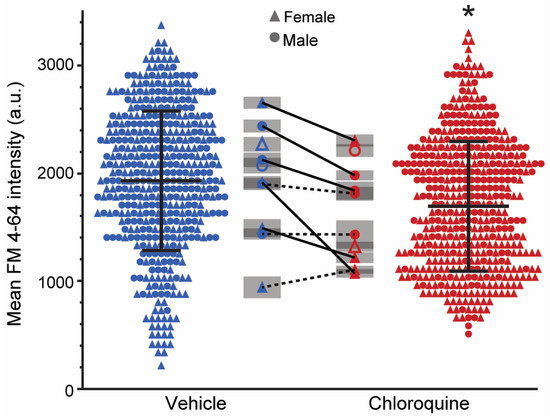 Mean FM 4-64 intensity at diaphragm neuromuscular junctions following vehicle or chloroquine treatment in the 80 Hz stimulation group. The scatter plots display FM 4-64 fluorescence intensity of individual neuromuscular junctions from vehicle (far left, blue) and chloroquine (far right, red) groups. Each point represents the FM 4-64 intensity of a single neuromuscular junction. The center line and error bars represent the mean and standard deviation for the entire group. After stimulation, high levels of FM 4-64 intensity were observed in both groups compared to no stimulation; however, the chloroquine-treated group displayed significantly lower FM 4-64 intensity compared to the vehicle group (F1,903 = 73, p < 0.01). Shaded plots positioned in the center next to each scatter plot represent the averaged values per hemidiaphragm with the mean FM 4-64 intensity for each hemidiaphragm as points and the standard error for neuromuscular junctions in that hemidiaphragm in the shaded bars. The black lines connecting points represent the hemidiaphragms from the same animal where one was treated with a vehicle and the other with chloroquine (solid and dashed lines represent statistically significant and non-significant differences, respectively). Symbols represent females and males as triangles and circles, respectively. *, p < 0.05 effect of treatment.