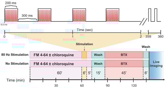Experimental protocol for evaluation of FM 4-64 uptake at diaphragm neuromuscular junctions following repetitive nerve stimulation. Hemidiaphragm preparations were assigned to chloroquine (50 µM) or vehicle treatment, which was maintained for the duration of stimulation and poststimulation period. In the stimulation group (top row), hemidiaphragms and attached phrenic nerve were incubated in Rees–Simpson solution containing FM 4-64 for 60 min. The phrenic nerve was stimulated at 80 Hz in 200 ms trains of 0.5 ms supramaximal pulses delivered at 40% duty cycle for 6 min (inset above). A 5-minute poststimulation incubation while in FM 4-64 followed. In the nonstimulated group (bottom row), hemidiaphragms were incubated for 71 min to control for stimulation. In both groups, hemidiaphragms were then washed three times for a total of 15 min and then incubated in α-bungarotoxin (BTX) containing Rees–Simpson solution for 45 min followed by a 6 min wash before confocal imaging. Hemidiaphragms were oxygenated during the preparation at all steps through imaging.
