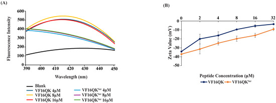 (A) Fluorescence emission spectra of NPN as a function of concentrations of the VF16QK and VF16QKser peptides in E. coli cell solutions. 10 μM of fluorescence probes were prepared in 10 mM of sodium phosphate buffer with a fixed bacterial cell density of 0.5. Fluorescence spectra were recorded with an excitation wavelength of 350 nm and emission of 390–450 nm. (B) Plot showing z potential changes of E. coli cells as a function of concentrations, 2 to 32 μM, of the VF16QK and VF16QK peptides.