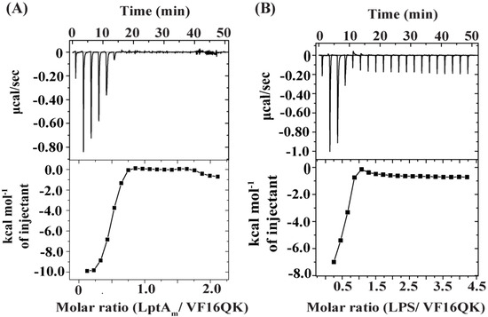 Isothermal titration calorimetry (ITC) of binding interactions of VF16QK with (A) LptAm, the periplasmic LPS transport protein of E. coli, and (B) the LPS-outer membrane. LptAm-peptide ITC studies were carried out in 50 mM of sodium phosphate buffer and 150 mM of NaCl at pH 7.0 and 25 °C. LptAm proteins in sample cells were titrated with 2 μL aliquots of peptides and the heat exchange was measured. For LPS–peptide interactions, LPS in sample cells were titrated with 2 μL aliquots of peptides in 10 mM of sodium phosphate buffer, pH 7.0, 37 °C.