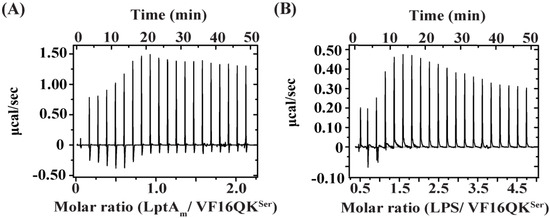 Isothermal titration calorimetry (ITC) of binding interactions of (A) LptAm and (B) the LPS-outer membrane with the VF16QKser peptide.