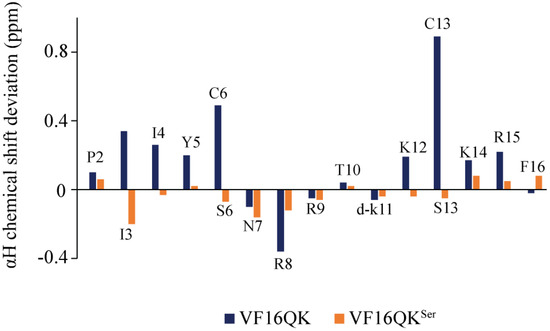 Bar diagram showing secondary chemical shifts of αH resonances of residues of the VF16QK and VF16QKser peptides.