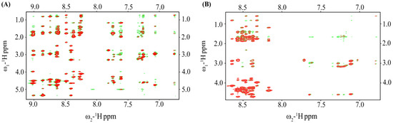 (A) Overlay of partial 1H-1H two-dimensional NOESY (red contour) and tr-NOESY (green contour) spectra of the VF16QK peptide and (B) overlay of partial 1H-1H two-dimensional NOESY (red contour) and tr-NOESY (green contour) spectra of the VF16QKser peptide. NOESY/tr-NOESY spectra show NOEs involving downfield shifted amide and aromatic proton resonances along the ω2 dimension with the upfield shifted aliphatic proton resonances along the ω1 dimension.