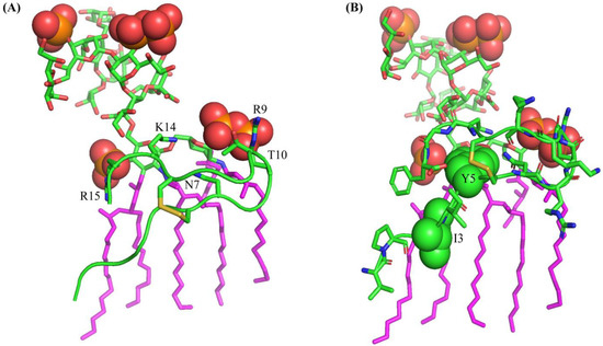 Docked structure of LPS-VF16QK showing (A) potential ionic and polar interactions among residues R9, N7, T10, K14 and R15 with the phosphate groups (in red sphere) of the lipid A moiety of LPS and (B) potential non-polar packing interactions of the residues I3 and Y5 with the acyl chain of LPS.