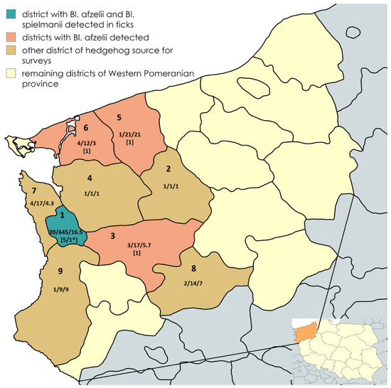 Location of retrieval sites for hedgehogs Erinaceus sp in Western Pomeranian Province, Poland: 9 districts: (1) Szczecin District, 53°26′17″ N 14°32′32″ E—city of Szczecin, (2) Łobez District: 53°32′20″ N 15°33′46″ E—Węgorzyno town, (3) Stargard District: 53°20′15″ N 15°02′16″ E—Stargard town, (4) Goleniów County: 53°29′46,79″ N 15°03′41,12″ E—Maszewo town, (5) Gryfice District: 53°54′24″ N 15°22′03″ E—Natolewice village, (6) Kamień Pomorski District: 53°50′29″ N 14°36′41″ E—Wolin town, 53°58′08″ N 14°46′45″ E—Kamień Pomorski town, (7) Police District: 53°39′26″ N 14°30′38″ E—Trzebież village, 53°25′48″ N 14°27′58″ E—Mierzyn village, 53°26′07″ N 14°24′32″ E—Dołuje village, (8) Choszczno District: 53°10′09″ N 15°25′10″ E—Choszczno town, 53°06′23″ N 15°24′25″ E—Zwierzyn village, (9) Gryfino District: 52°52′45″ N 14°12′08″ E—Cedynia town, 52°46′16″ N 14°33′40″ E—Troszyn village. Numbers listed are number of hedgehogs infested/number of ticks/average number of ticks per hedgehog. In square brackets: number of infected ticks and so the number of hedgehogs carrying a tick infected with Bl. afzelii/* Bl. spielmanii.