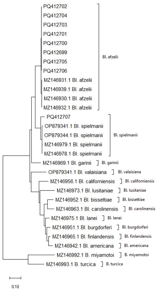 - Wodecka, B.; Kolomiiets, V. Genetic diversity of Borreliaceae species detected in natural populations of Ixodes ricinus ticks in northern Poland. Life 2023, 13, 972. [Google Scholar] [CrossRef]