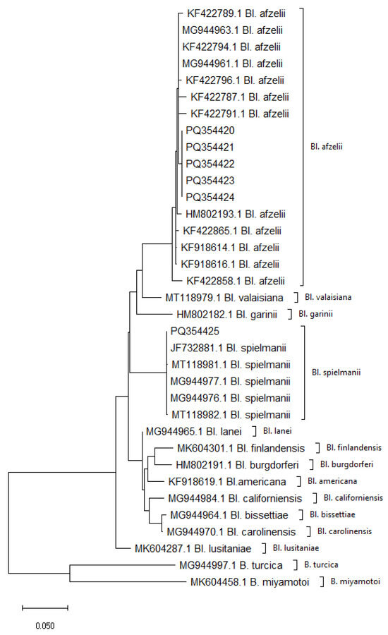 Sequences of the flaB gene and mag-trnI intergenic spacer of Borreliaceae spirochetes have been deposited in the GenBank database. The flaB gene sequences were deposited under accession numbers: PQ354420-PQ354424 (Bl. afzelii), PQ354425 (Bl. spielmanii). The sequences of the mag-trnI intergenic spacer deposited in the GenBank database are as follows: PQ412699-PQ412706 (Bl. afzelii), PQ412707 (Bl. spielmanii).