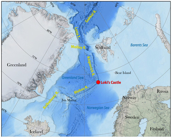 Spang et al. (2015) [34] conducted a metagenomic investigation of marine sediment obtained about fifteen kilometers away from Loki’s Castle, an active hydrothermal vent in the Arctic Mid-Ocean Ridges (AMOR; 73.763167 N, 8.464000 E) that are ~4000 km long, located at 3283 m below sea level (Figure 1; adapted from [Fredrik Sahlström et al., 2023]) [26], which resulted in the discovery of a novel archaeal phylum, Lokiarchaeota (low-key-ar-kay-oh-tuh or Lokiarchaeia; henceforth referred to as Loki), which are the closest living relatives of all eukaryotes. Later, it was described as the earliest known member of the Asgard superphylum [35].