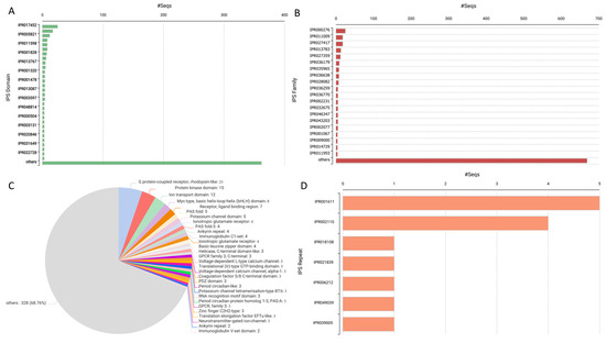 Figure 4A illustrates the proportions of various InterPro Scan domains connected to the genes involved in sleep. Domains are on the y-axis while the number of sequences discovered for individual domains is on the x-axis. Out of all the domains, “GPCR, rhodopsin-like” IPR017452 stands out, with roughly 400 sequences (Figure 4A). Other comprehensible domains include the “Ion transport domain” (40,128), “Myc-type, basic helix-loop-helix” (71,210), and “Receptor, ligand binding area” (55,661). These domains show varying levels of sequences, and they may be related to sleep-related behaviors. Moreover, the domains “Period circadian protein” (IPR048814) and “Period circadian-like protein” (IPR022728) are highlighted since the molecule plays an important role in the control of circadian rhythms. It is seen that all the domains identified in the “others” category are infrequent and occur only occasionally. The existence of numerous protein domains demonstrates the number of molecular factors involved in the process of sleep regulation.