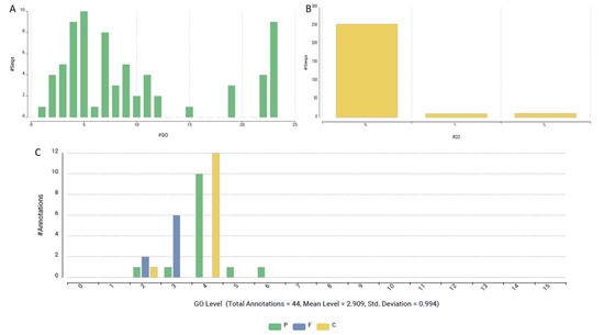 Gene Ontology (GO) term distribution across biological processes, molecular functions, and cellular components of Lokiarchaeota ortholog sequences. (A) Frequency of annotations per GO term showing diverse distribution patterns. (B) Dominance of annotations at GO level 0, with significantly fewer terms at higher levels. (C) Breakdown of annotations across GO levels, with categories represented by biological processes (P), molecular functions (F), and cellular components (C). Total annotations amount to 44, with a mean level of 2.909 and a standard deviation of 0.994.