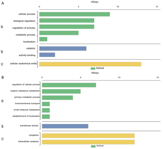 Gene Ontology (GO) enrichment analysis results of Lokiarchaeota ortholog sequences. (A,B) display the enriched GO terms across three main GO categories: biological process (BP, green), molecular function (MF, blue), and cellular component (CC, yellow). The bar length indicates the number of sequences associated with each term, showing the most enriched terms in each category.