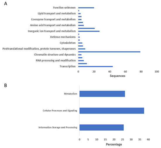 Figure 8B shows how various categories of functions are divided in terms of gene sequences. On the X-axis, the numbers represent the number of sequences and on the Y-axis; the letters represent the functional categories. The largest number of sequences is in the category “signal transduction mechanisms” with more than 80 sequences that can be associated with intensive participation in signal reception and response. The term “transcription” is linked to approximately 40 series, which proves its relevance to the regulation of gene expression. There is also a noticeable representation of categories such as “Inorganic ion transport and metabolism” and “Energy production and conversion”. The “other” categories, namely, “function unknown”, “Posttranslational modification, protein turnover, chaperones”, and “Translation, ribosomal structure”, also present moderate levels of sequence counts; hence, these are diverse but are seemingly less functional. Some examples include “Secondary metabolites biosynthesis, transport and catabolism”, “Defense mechanisms”, and “Extracellular structures”, many of which contain few sequences, and could be described as specializing in some function or rare in the genome. The distribution of these cellular processes shows that the processes of signal transduction and transcription are more dominant compared to the other functions.
