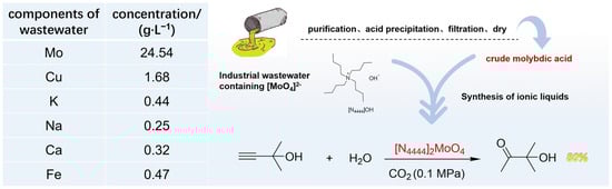 For the reactions of CO2-promoted hydration of propargyl alcohols, most catalysts are typically purchased in high purity or synthesized using pure materials. This might be beneficial for mitigating the interference from impurities and for acquiring more precise catalytic data in the laboratory. Nevertheless, this has also limited further studies and applications of these catalysts in industries. In our previous report [51], we successfully used pigment waste as a source of metal catalysts combined with IL for efficient propargyl alcohols hydration catalysis, demonstrating a potential method for creating a catalytic system from recyclable waste. However, the IL component, as well as its synthetic materials in the system still required high purity. Therefore, in this work, we turned our attention to exploring a more general and cheap way for obtaining ILs. (NH4)2MoO4 is a pivotal catalyst for desulfurization processes in the petroleum refining industry. It is also a veterinary medicine in agricultural applications and a material in pigment production [52]. However, the industrial production of (NH4)2MoO4 is typically accompanied by the emission of wastewater containing Mo, Fe, Cu, etc. (as shown in Figure 1), posing significant environmental risks and leading to the wastage of molybdenum resources. Hence, we utilized this wastewater as a starting material for the synthesis of the [N4444]2[MoO4] IL. Initially, the wastewater underwent a series of steps, including purification, acid precipitation, filtration, and drying, to yield crude molybdic acid (Part 1 in Supplementary Materials). Subsequently, this crude molybdic acid was employed in the synthesis of [N4444]2[MoO4], following standard procedures (Figure 1). After obtaining the [N4444]2[MoO4] IL, we confirmed that its purity was around 92% through an ICP test, and the percentage of major metals in this catalyst was: Mo (13.57%), Cu (0.02%), Fe (0.004%). Promisingly, when this synthesized [N4444]2[MoO4] was applied to the target reaction, the catalytic yield reached 80%, suggesting that the [N4444]2[MoO4] catalyst showed remarkable tolerance to the catalytic environment. This experiment not only presented an innovative approach for the treatment and recycling of ammonium molybdate wastewater but also highlighted a feasible strategy for the large-scale implementation of CO2-promoted hydration processes.