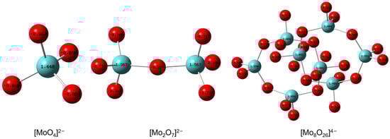 The calculation of molecular structures and NBO charges of oxygen atoms in various molybdates. The structures were calculated with DFT using the Gaussian 16 program package. Theory: B3LYP; basis sets: 6–31++G* (H, C, N, and O atoms) and LanL2DZ (Mo atoms). The red balls represented O atoms, and blue balls represented Mo atoms.