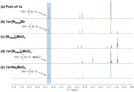 Subsequently, the function of [MoO4]2− in the activation of hydroxyl groups within propargyl alcohols was investigated. According to the reported literature [17], this activation could be inferred from the shape and chemical shift in the hydroxyl signal peak in the 1H NMR spectrum of 1a. As shown in Figure 3, five systems under identical conditions were prepared. For the pure substrate 1a, the hydroxyl proton displayed a sharp peak at δ = 5.275 ppm, signifying its inactivated state (Figure 3a). The addition of [N4444]Br did not alter the shape or chemical shift in the hydroxyl peak in substrate 1a (Figure 3b), indicating that [N4444]+ could not activate the hydroxyl group. However, upon the incorporation of [N4444]2MoO4, the characteristic peak of the hydroxyl group in substrate 1a became broad and shifted. This observation conclusively demonstrated that [N4444]2MoO4 was capable of activating the hydroxyl group of 1a (Figure 3c,d). On the other hand, the introduction of Na2MoO4 did not induce any alterations in the profile or position of the hydroxyl signal (Figure 3e), thereby suggesting that the [MoO4]2− exhibited superior catalytic activity within ILs compared to its performance in traditional salts.