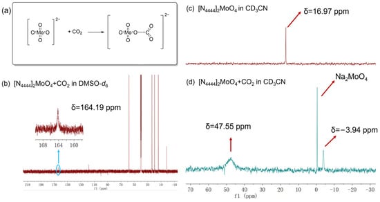 The possible mechanism of MoO4-CO2 adducts formation (a), 13C NMR spectrum of the MoO4-CO2 adduct (b), 95Mo NMR spectrum of [N4444]2MoO4 (c), and 95Mo NMR spectrum of the MoO4-CO2 adduct (d).