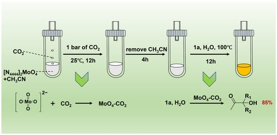 Conclusively, the catalytic activity of the MoO4-CO2 adduct in the hydration of propargyl alcohols was examined. The synthesis of the MoO4-CO2 adduct within the [N4444]2[MoO4] IL was carried out in accordance with the previously delineated methodology. Upon obtaining these adducts, propargyl alcohols and deionized water were introduced into the system, and the reaction was carried out following established protocols in Figure 5, in the absence of CO2. Upon completion, the resultant mixture was directly analyzed by 1H NMR. The result demonstrated that the reaction achieved a yield of 85%, which was close to the data obtained under standard conditions with CO2 gas as the carbon source. This finding confirmed that the MoO4-CO2 adduct independently catalyzed the hydration process with considerable activity, thereby demonstrating the superior catalytic capabilities of the [N4444]2[MoO4].