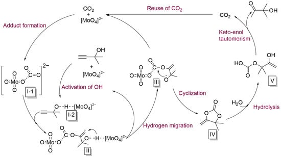 Based on previous reports and the experimental results obtained above [48], a possible catalytic mechanism for this system was proposed (Figure 6). Initially, under the influence of [N4444]2[MoO4], the hydroxyl group in the substrate was activated, enhancing the nucleophilicity of the oxygen atom in the hydroxyl group (I-1). Simultaneously, the interaction between the molybdate anion component and a molecule of CO2 led to the formation of adduct I-2, enabling the conversion of CO2 under mild conditions. Subsequently, the adduct I-2 attacked the triple bond in I-1, forming intermediate II, which underwent a hydrogen migration from the hydroxyl group to generate intermediate III. Afterward, the negatively charged oxygen in intermediate III attacked the carbonyl carbon. The intramolecular cyclization occurred and carbonate IV was produced. Finally, the carbonate reacted with water to produce V, subsequently undergoing keto-enol tautomerism and releasing one molecule of CO2 to transform into the final target product.