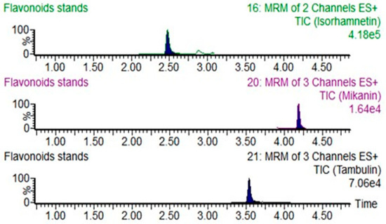 To characterize the flavonoid compounds in M. micrantha, the chemical structures of compounds 1–3 were elucidated using NMR and HR-ESI-MS techniques (Figure 1), and we compared the NMR data to the references. These compounds were identified as Mikanin (1), Tambulin (2), and Isohamnetin (3). Their purity was confirmed to exceed 95%, as analyzed by UPLC-MS (Figure 2), along with 1H-NMR and 13C-NMR spectroscopy. The detailed spectroscopic data for these known flavonoids samples are as follows (Supplementary Figures S1–S5).