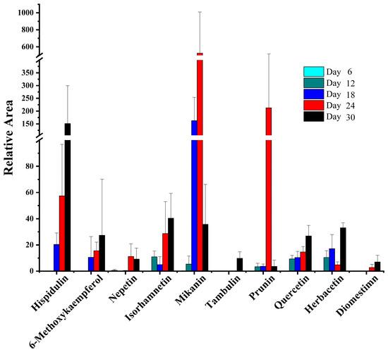 The contents of flavonoids increased over cultivation time. Isorhamnetin, Mikanin, Prunin, Quercetin, and Herbacetin could be detected after 6 days, and the others could only be detected after 12 days. The content change of Prunin over 30 days was significant (Figure 3). By 24 days, the content had increased, prominently, but it suddenly decreased at 30 days. We hypothesize that prunin, a 7-O glycoside of naringenin, may reach a threshold concentration, at which point root-associated microorganisms metabolize the glycoside component for nutrients, leaving naringenin, a key precursor for various flavonoids and isoflavonoids, as the remaining structure. In the data tested, prunin content appeared a significant area (17,391.95) in a single test at day 24, which may be a threshold point.