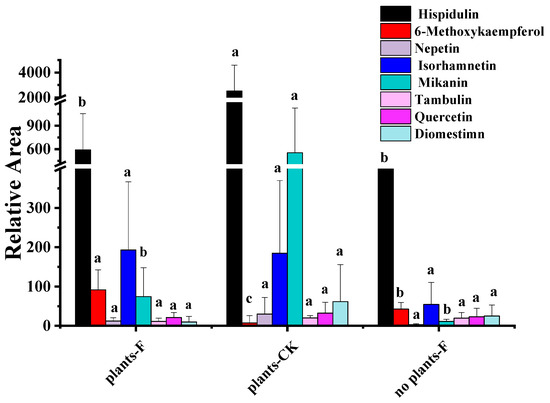 Content changes of flavonoids in the pot experiment. Plants-CK: plants with no additives. Plant-F: plants with flavonoids. No plant-F: no plants with flavonoids. Different letters indicate significant differences between the two groups, and the same letters indicate no significant difference between the two groups.