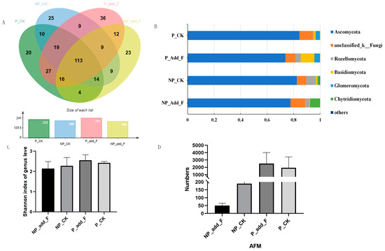 To evaluate changes in soil microbial abundance and diversity, 16S rRNA and ITS sequencing were used to track fungal and bacterial communities across treatment groups. The analysis of fungal diversity revealed that 113 fungal genera were shared among the four treatments (Figure 5A). The P_Add_F group contained 36 unique fungal species, followed by the NP_CK group with 25 unique species, and the NP_Add_F and P_CK groups with 23 and 20 unique species, respectively. This suggests that adding flavonoids enhances fungal community diversity in the soil. A fungal genus-level classification graph is shown in the Supplementary Material (Figure S6A).