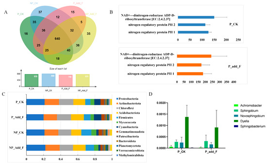 At the genus level, 640 bacterial species were shared across treatment groups (Figure 6A). The NP__CK and NP_Add_F groups contained 37 and 35 unique species, respectively, while the P_CK and P_Add_F groups included 16 and 15 unique species. Sphingobacterium was present only in the P_CK and NP_F treatment groups, while Sphingobacterium, Kroppenstedtia, Novosphingobium, and Sphingobium were not detected in LB medium experiments, likely due to the complex soil environment, where microbial interactions can lead to mutual promotion or inhibition. A bacterial genus-level classification graph is shown in the Supplementary Materials (Figure S6B).