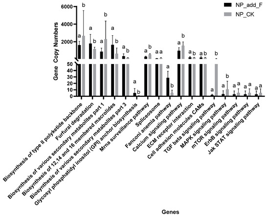 KEGG functional predictive analysis of Pathway Level 3. NP-F: Noninvasive soil with crude flavonoids extract. NP-CK: Noninvasive soil without addition. One-way ANOVA was used to assess differences between groups. Different letters indicate significant differences between the treatment groups (p ≤ 0.05), and the same letters indicate no significant difference between the groups, n = 5.